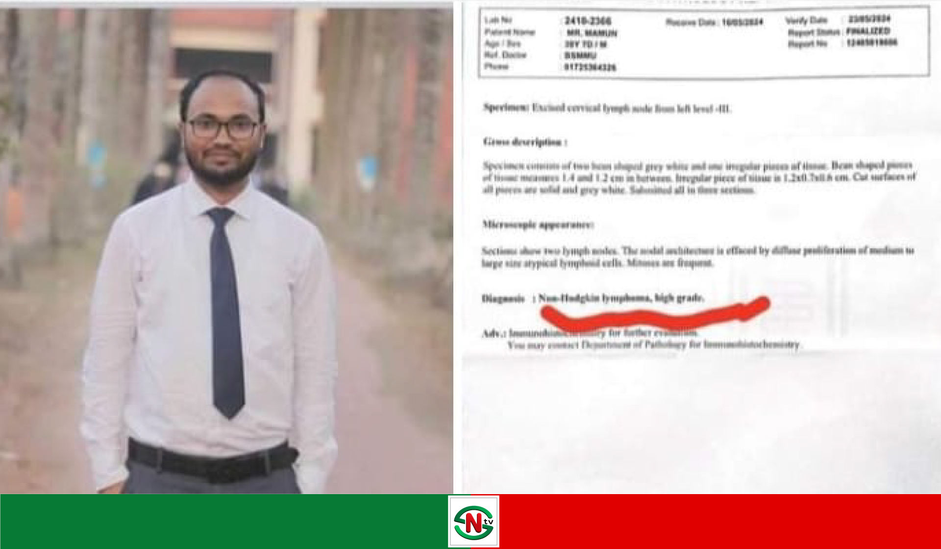 গতো রোজার ঈদের পর থেকে টানা জ্বর ছিলো। জ্বরের কারণ খুঁজতে গিয়ে জানা যায়, হিমোগ্লোবিন কম (ইবনে সিনা, উত্তরা)। এটার উৎস খুঁজে বের করার জন্য বায়োপসি করা হয় (পিজি হাসপাতাল)। বায়োপসি রেজাল্টে জানা যায়, NON-HODGKIN LYMPHOMA HIGH GRADE ( ব্লাড সেল ক্যান্সার)।