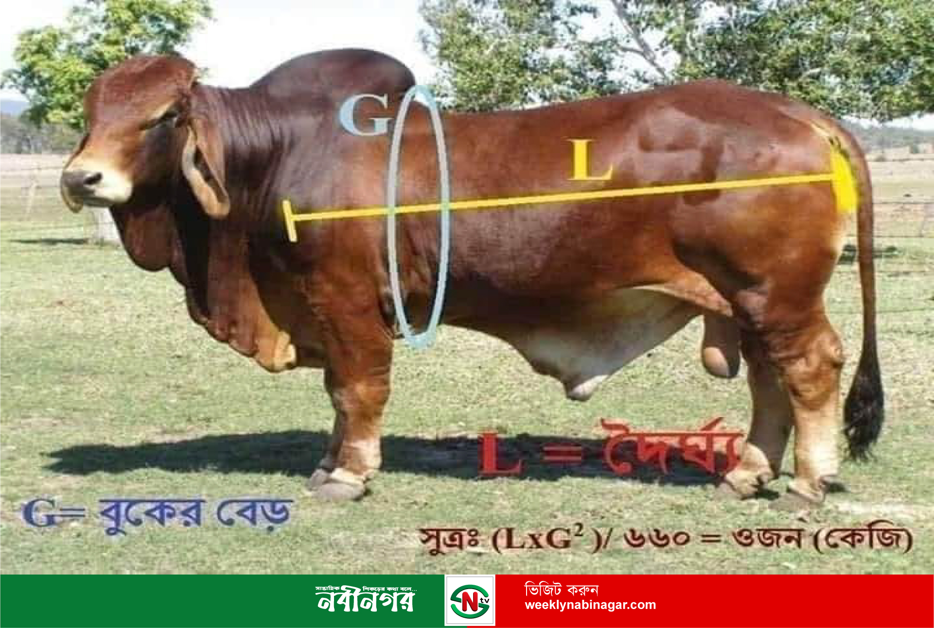 কেউ যদি একটি পশুর ছবি দেখে এর ওজন সম্পর্কে ধারণা পেতে চায়, তাহলে তাঁকে মাত্র দুইটা তথ্য নিতে হবে‌ পশুর মালিকের কাছ থেকে। প্রথমত, যে পশুর ওজন নির্ণয় করতে চাচ্ছেন, সেই গরুকে প্রথমে সোজা করে দাঁড় করাতে হবে। এরপর একটি গজ/ফিতার সাহায্যে গরুর সামনের পাজরের উঁচু হাড় থেকে পশ্চাৎদেশ পর্যন্ত দৈর্ঘ্য (L) ইঞ্চিতে মেপে নিতে হবে। এরপর পশুটির বেড় (G) ইঞ্চিতে মেপে নিতে হবে (সংযুক্ত ছবি দেখে নিন)। ইঞ্চিতে দৈর্ঘ্য (L) আর বেড় (G) এর তথ্য পাওয়া গেলে সহজেই হিসেব করে পশুর সম্ভাব্য ওজন বের করা যাবে। এখানে ফর্মুলাটি হলো;