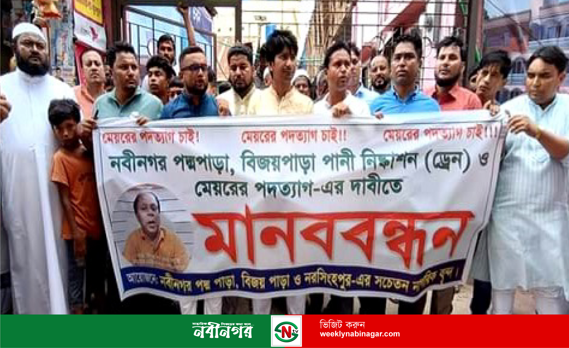 ব্রাহ্মণবাড়িয়ার নবীনগর পৌরসভার বিজয়পাড়ায় জলাবদ্ধতা নিরসনের দাবীতে এবার পৌরসভার মেয়র এডভোকেট শিব শংকর দাসের পদত্যাগ চাইলেন ভুক্তভোগীরা। গত বৃহস্পতিবার ২০ জুন নবীনগর পৌরসভা কার্যালয়ের সামনে ভুক্তভোগীদের উদ্যোগে অনুষ্ঠিত এক মানববন্ধন থেকে মেয়রের ওই পদত্যাগের দাবী তোলা হয়।